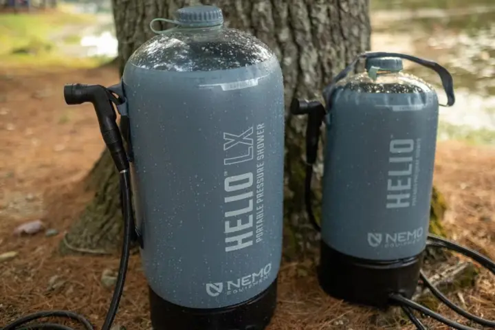 The NEMO Helio Pressure Shower is a popular upgrade from basic gravity bags. It uses an 11-liter soft-sided tank pressurized with a foot pump, allowing it to sit on the ground instead of hanging from a branch.