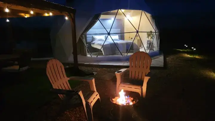 - Key Amenities: Private domes and cabins, A/C and heat, shared high-end kitchen, modern bathhouse, fire pits.