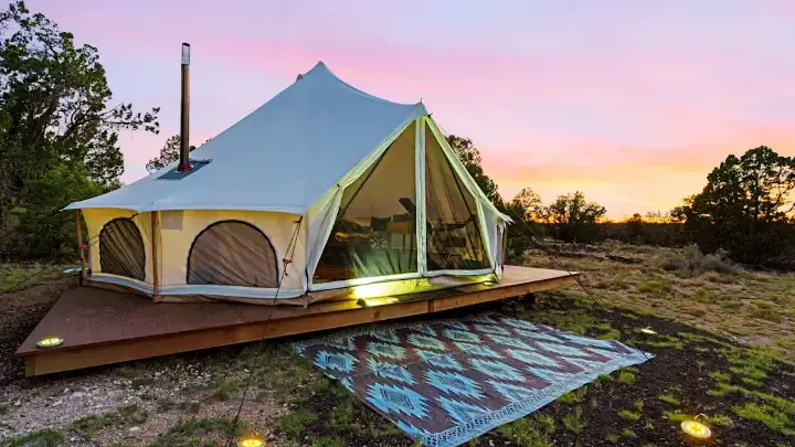 Evening settles over the desert like a velvet curtain. You’ve spent the day walking the rim, dust on your boots, camera full of color and shadow. Then, just half an hour south of the canyon, a golden tent glows against the fading sky.
