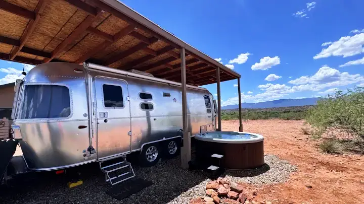 Somewhere between classic road trip and desert dream sits a polished Airstream—shining silver under the Arizona sun. Step inside, and the world slows down: a soft bed, a kitchenette, air conditioning, and the cozy hum of a tiny home that feels perfectly your size.